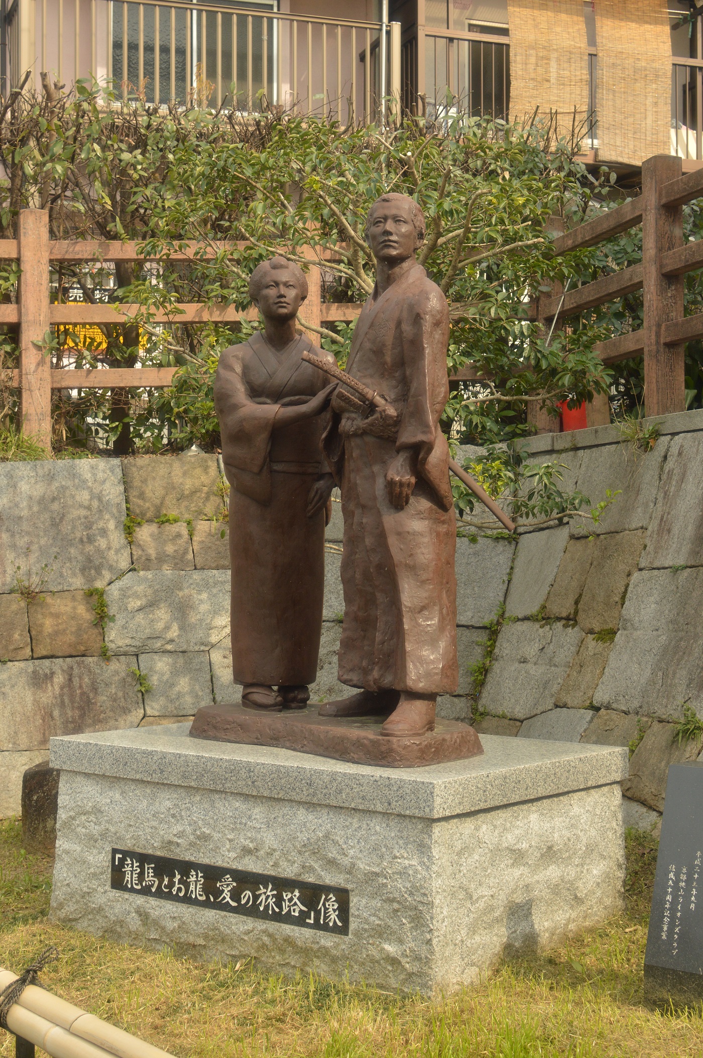 橋の下を流れる川沿いに坂本龍馬像