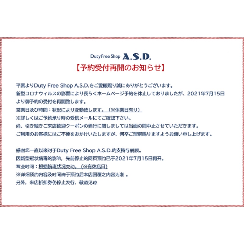長らく休止していましたホームページ予約の受付を再開しました。 ご予約をお待ちしております。 URL:https://www.a-s-d.co.jp/dutyfree/ ※休業日・時短営業等によりご希望に添えない場合がございます。 何卒ご理解・ご了承下さいますようお願い致します。
