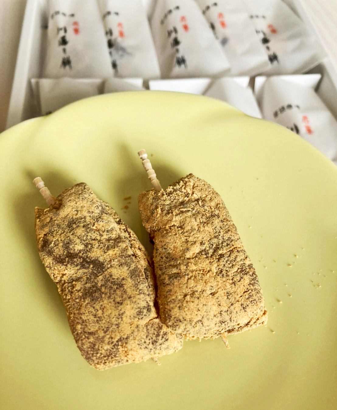 きな粉をまとった一口サイズのお餅が爪楊枝に刺さっています。