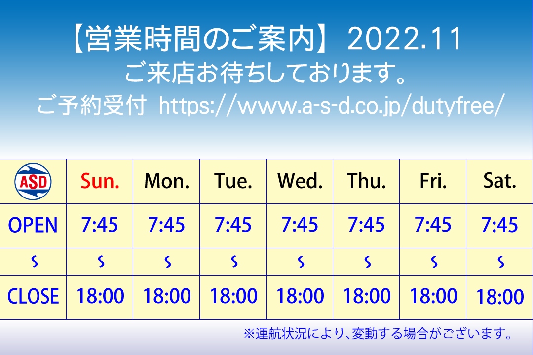 2022年11月 『免税店 Duty Free Shop A.S.D.』 の営業時間を