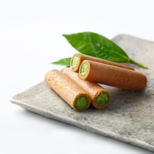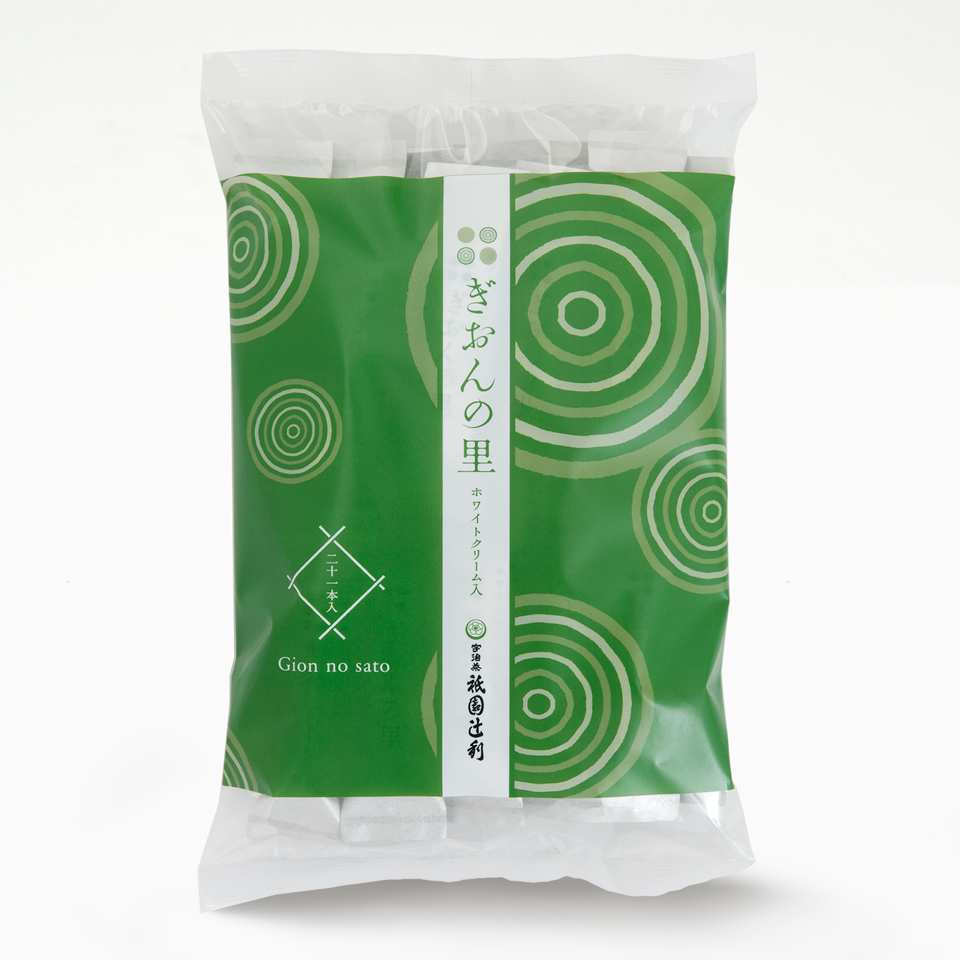 ◆「ぎおんの里」は、優しい甘さのホワイトクリームを、抹茶の鮮やかな緑が映えるパリッと歯ざわり良い薄焼きロールせんべいで包んだ、祇園辻利ロングセラーの人気抹茶菓子。
