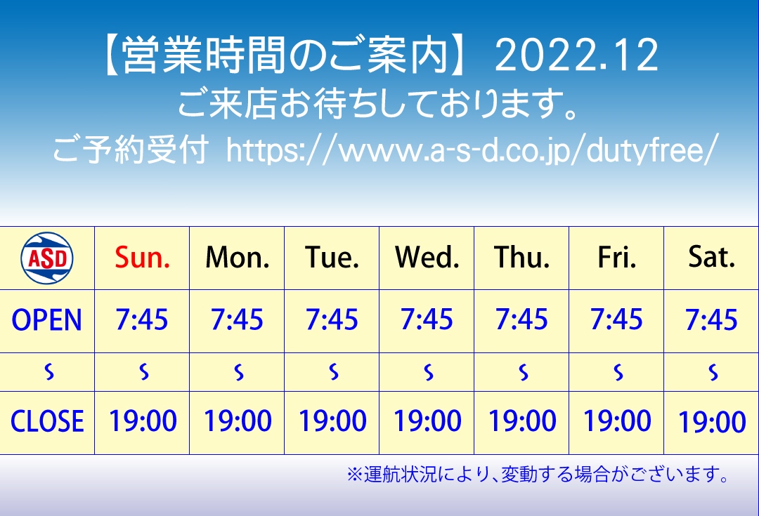 2022年12月 『免税店 Duty Free Shop A.S.D.』 の営業時間を
