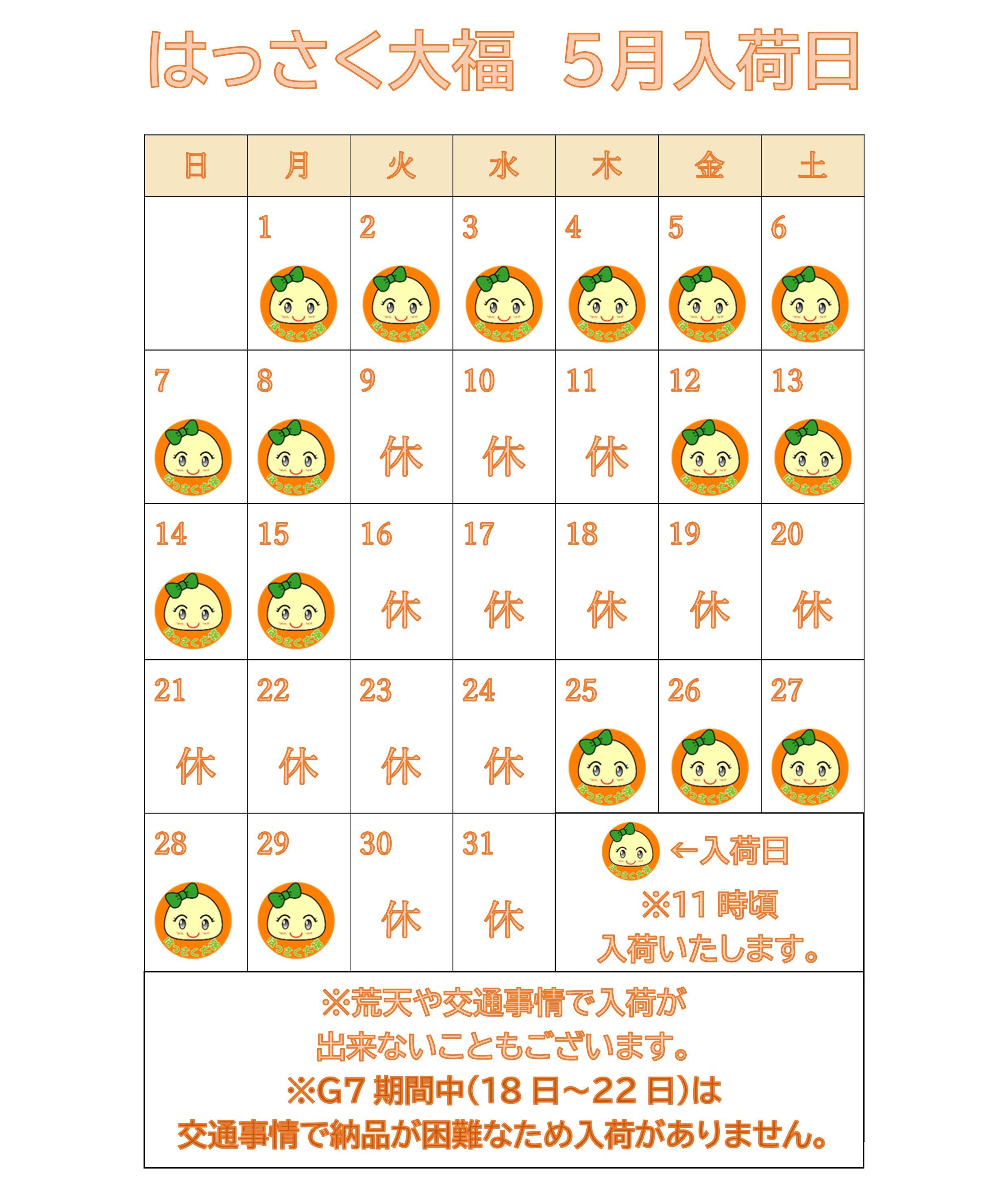 2023年5月の入荷予定は以下のカレンダーの通りです。