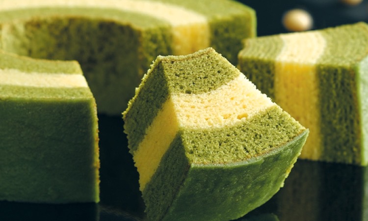 そこに、宇治抹茶と煎茶をブレンドした抹茶生地を層に重ねました。
