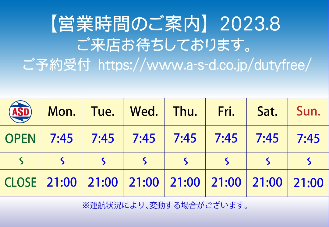 2023年8月 『免税店 Duty Free Shop A.S.D.』 の営業時間を