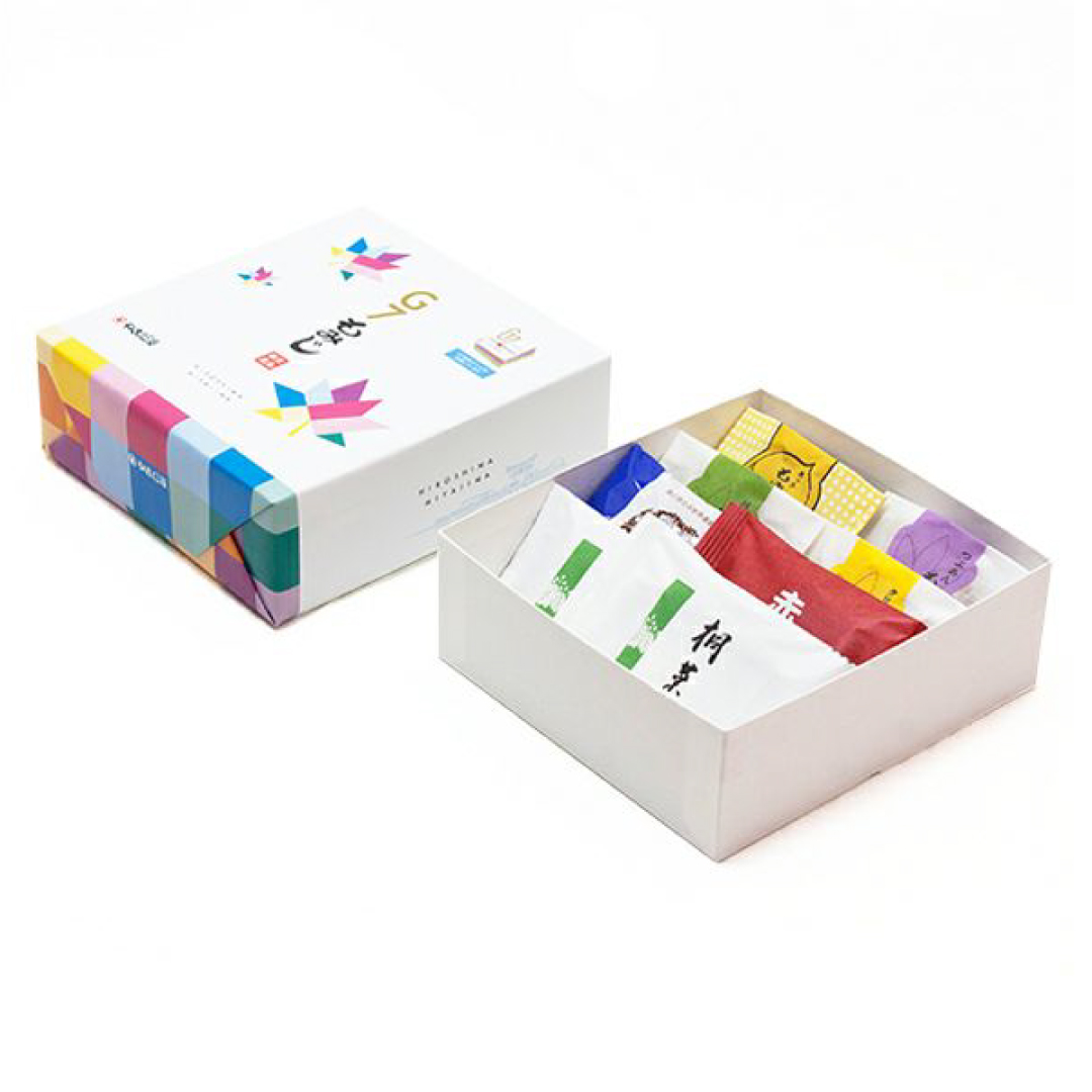 内容:桐葉菓2個・クリームもみじ1個・つぶあんもみじ1個・栗っ子もみじ1個・抹茶もみじ1個・赤もみじ1個・宮島ポミエ1個
