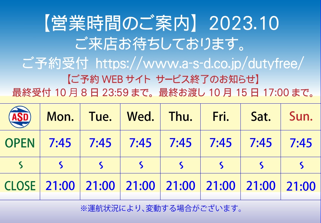 2023年10月 『免税店 Duty Free Shop A.S.D.』 の営業時間を
