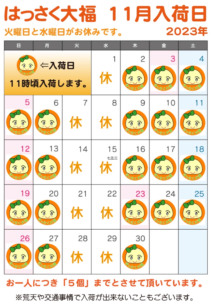 2023年11月の入荷予定は以下のカレンダーの通りです。
