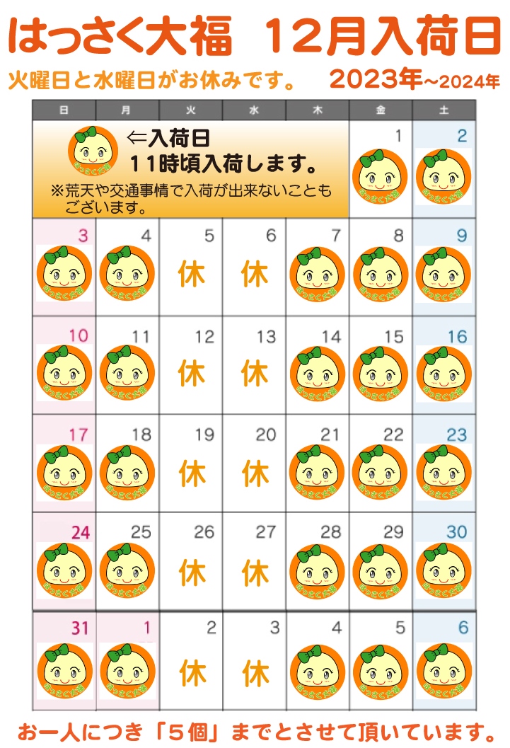 2023年12月及び2024年1月第一週の入荷予定は以下のカレンダーの通りです。