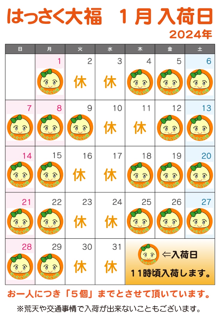 2024年1月の入荷予定は以下のカレンダーの通りです。