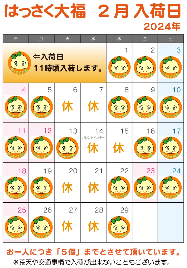 2024年2月の入荷予定は以下のカレンダーの通りです。