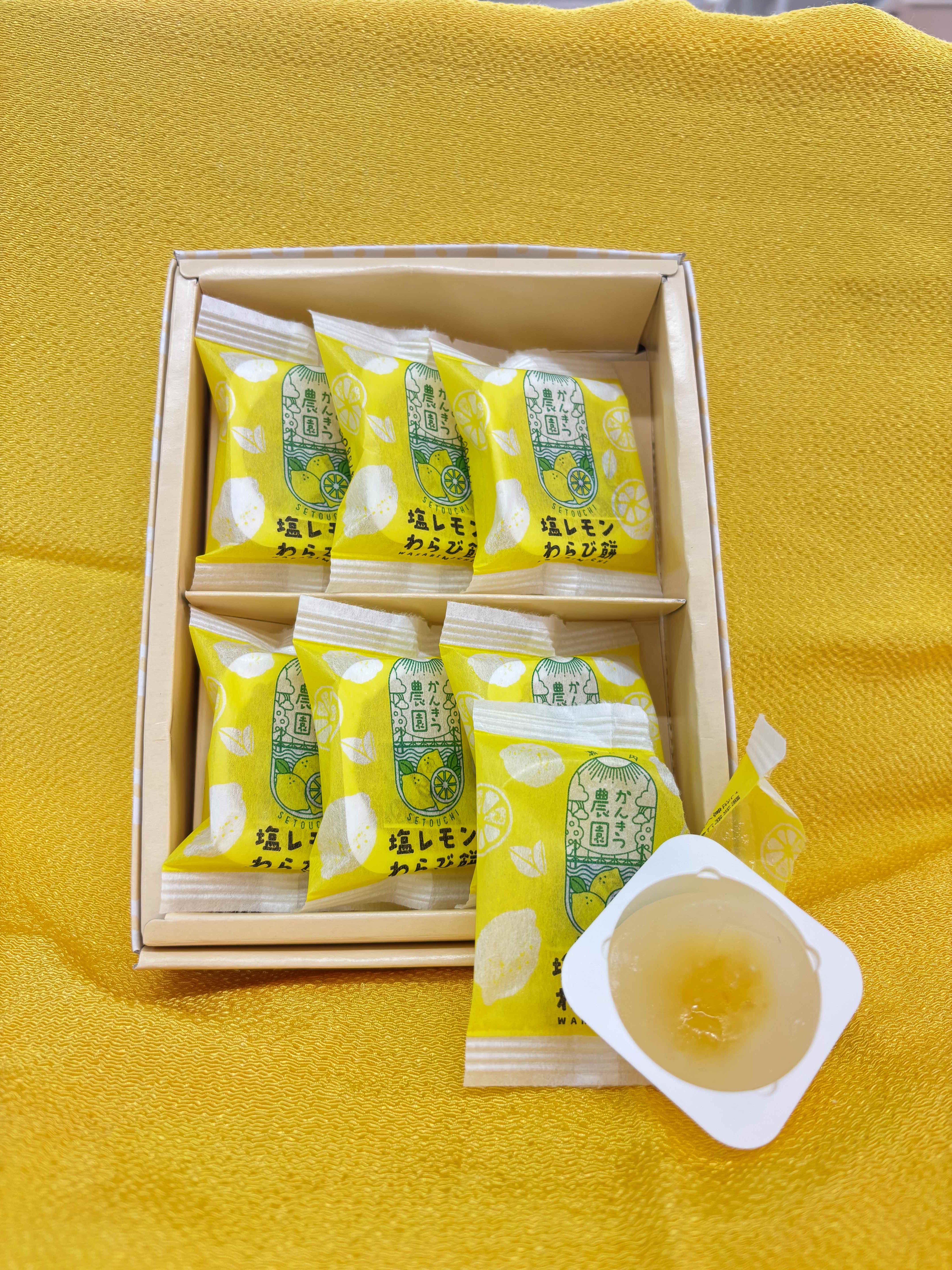 瀬戸内レモンの果皮をコトコト煮込んだレモンミンスと伯方の塩をいれ、もちもちのわらび餅でつつみました!